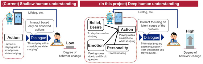 With the diversification of lifestyles and values, AI-equipped robots and agents are expected to serve as our partners in various life stages of our lives, including education, employment, and retirement and to suggest actions and encourage growth through individually tailored responses. To meet this demand, it is no longer sufficient for AI just to be cognizant of the behavior it observes but also needs to understand the latent mental states that underlie the behavior. That is, the AI needs to understand the beliefs, desires, and intentions that underlie the behavior as well as the personality and values that shape them. Understanding this causal relationship between behavior and mind is critical toward achieving empathetic AI and human-AI symbiosis (refer to the figure). The goal of this joint research is to develop causal inference techniques to understand the behavior-mind causal links from observable behavioral cues (such as life logs). The technical challenge is to enable the AI to discover deep causal relationships solely from observable data without being limited by, and even discovering beyond, already acquired knowledge (e.g., theories on human behavior).