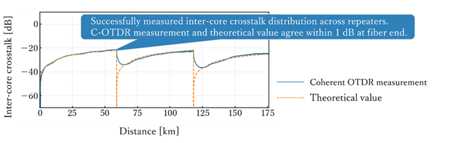 As a result of this trial, we succeeded for the first time in the world in confirming that coherent OTDR can be used to detect faults and measure fiber loss profile in optical submarine cable systems employing multicore fiber. Furthermore, by utilizing the measurement results of coherent OTDR, it was also confirmed that the distribution of inter-core crosstalk along the fiber, including through repeaters, can be measured. This marks the world’s first successful visualization of inter-core crosstalk over long distances.