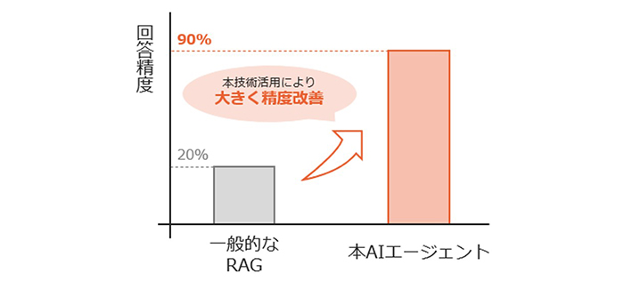 AIで応対文を生成する際の一般的な手法として、RAG(Retrieval-Augmented Generation)が知られています。RAGはマニュアルを参照することで回答可能な簡単な質問に対して、定型的に回答する場合などでは高い精度を示します。しかし、本AIエージェントの対象である、AIチャットボットで対応しきれない難易度の高い質問に対して、単純にRAGを適用した場合の回答精度は約20%に留まります。これは、難易度の高い質問に回答するためには、スタッフの暗黙知を考慮した上で自律的に情報収集する必要がある一方で、複数のマニュアルを参照する中で情報が混合し、ハルシネーションが発生するためです。