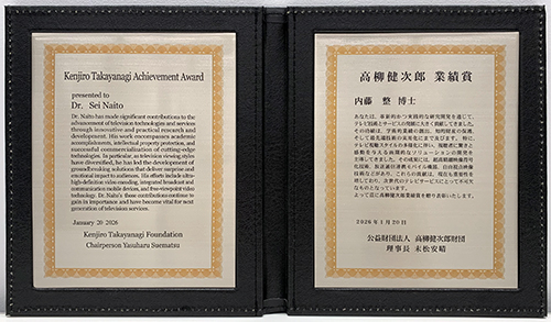 株式会社KDDI総合研究所の、内藤 整 取締役執行役員副所長は、公益財団法人高柳健次郎財団より、「テレビジョン技術の高度化に関する先駆的研究開発と実用化」に関する研究成果が高く評価され、「2025年度 高柳健次郎業績賞」を授与されました(2026年1月20日開催の高柳健次郎賞贈呈式にて)。